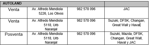 Grupo Inchcape representante autorizado de las marcas Suzuki, JAC, Renault, Great Wall, HAVAL, Changan y DFSK mediante Derco Peru S.A. y Autocar del Perú S.A. respectivamente, informa que, la empresa AUTOMOTORES YOSHIVAL S.A.C. finaliza sus actividades comerciales de venta y posventa en el distrito de Los Olivos desde el 01 de Setiembre de 2024. A partir de ello, todas las actividades relacionadas con nuestras marcas, serán atendidos exclusivamente por nuestro concesionario Autoland S.A. en las siguientes direcciones: